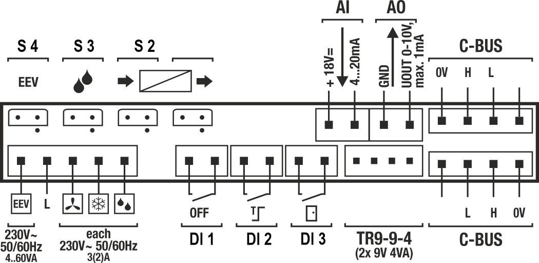 Feste Eingangsbelegung/Ausgangsbelegung für Fühler, Steuereingänge und Relais