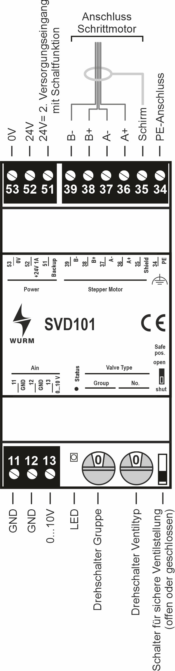 Zweiter 24V= Versorgungseingang („Backup“ Klemme 51) mit Schaltfunktion: Ventil wird unabhängig von Stellgröße in sichere Ventilstellung gefahren (SVD001 und SVD101)